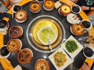 5. Các bữa ăn: 03 bữa sáng (Ăn sáng: Bún hoặc mỳ) + 04 bữa chính tiêu chuẩn 40NDT/suất.