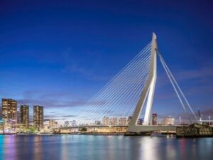 - Cầu Erasmus được xây dựng năm 1994, hoàn thành 2 năm sau đó, cầu Erasmus đã trở thành công trình tiêu biểu của cả đất nước Hà Lan. Erasmus là chiếc cầu dây văng nối hai phần Đông Tây của thành phố trông như một dải lụa vắt qua sông Nieuwe Maas. Cầu là niềm tự hào của Rotterdam.